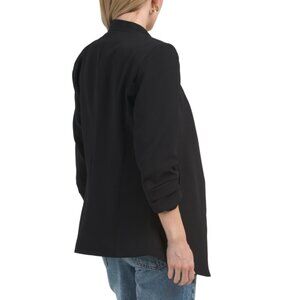 shoulder pads, ruched sleeve details, fabric provides stretch, 2 front pockets