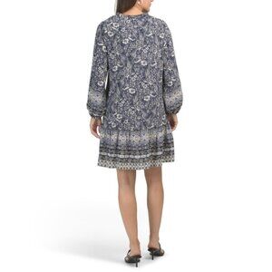 Brand New Color: Chambray elastic cuffs, 2 side pockets, lightweight and breathable, floral pattern, keyhole front with tie closure long sleeve, ruffle neck, mini dress 35.5in long, taken from size S pull on polyester imported hand wash