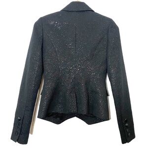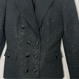 Black sleek structured tuxedo blazer jacket featuring subtle metallic accent and double breasted satin round button front. Flap pockets & back vent. Shoulder pads.