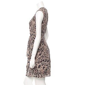 Grey and multicolor Rachel Zoe silk sleeveless dress with abstract print throughout, surplice neckline, ruching at waist and zip closure at back.
