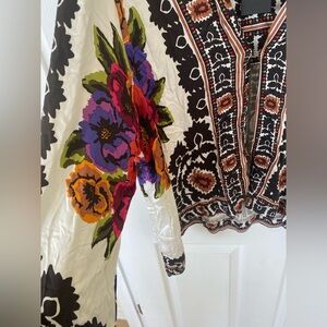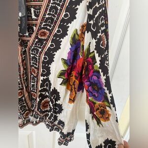 Vibrant blouse with floral patterns. Features black, white, and colorful designs. Perfect for a bold look.100% Rayon