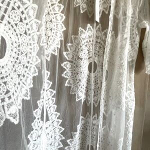 This lightweight, longline, white lace cover-up features delicate sheer fabric, intricate embroidery and scalloped edges