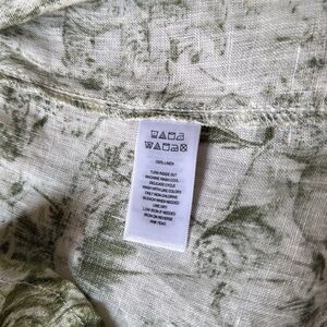 Stylish button down linen shirt with a green and white tropical print. Perfect for casual outings.