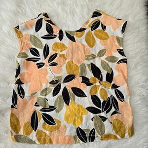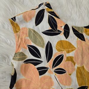 The Rachel Zoe Floral Linen Blouse in size medium features a bold modern print in pink,golden mustard, black and muted green, perfect for a casual occasion during the summer or fall seasons. This sleeveless blouse has a round neckline, pullover closure with buttons down the back, and a relaxed fit, adding a comfortable and stylish touch to any outfit. Made from linen fabric, this blouse from the brand Rachel Zoe is a versatile and trendy addition to any woman's wardrobe.