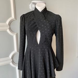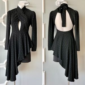 Designed with a draped cross-front neckline and an asymmetric ruffled hem. A keyhole decorates the bust with a sultry open back.