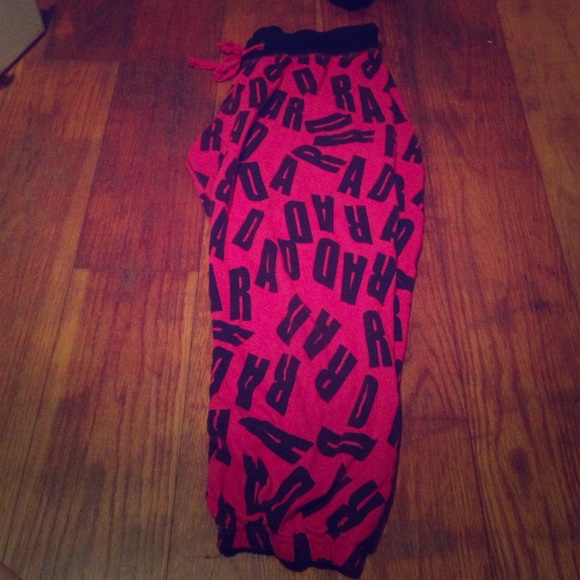 pink sweat pants that say "RAD" all over them with a drawstring waist and sinched in ankles. worn only a couple times