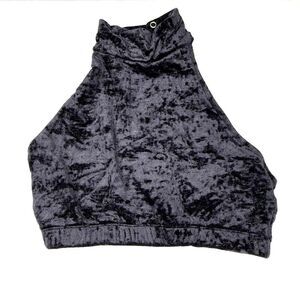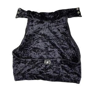 Sleek and fierce RAD pole dance top in a luxe crushed black velour. This high-neck halter style snaps at the back of the neck and features a fully open back — ideal for pole practice, dance, aerial, or performance wear.