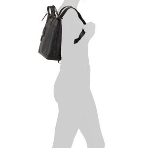 gold tone hardware, brand logo accents, pebbled finish, dual top carry handles, detachable logo charm, adjustable backpack straps