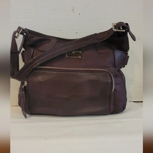 Bradley of London - Nylon & Leather trimmed shoulderbag. There is a zippered compartment on the front of the bag and a slide pocket on the back. There is a single compartment with a zippered pocket on the inside. Please see all pictures.