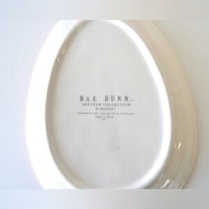 Charming Rae Dunn egg-shaped plates featuring a bunny design. Pink trim adds a playful touch. Perfect for spring gatherings.