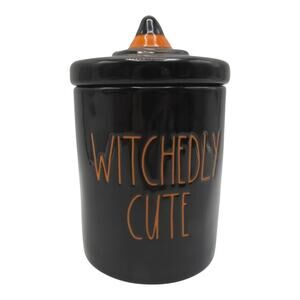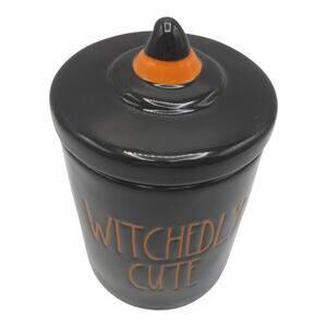 Rae Dunn "Witchedly Cute" Halloween ceramic canister. The black jar has the phrase "Witchedly Cute" written on it in orange and comes with a lid featuring a small witch's hat.