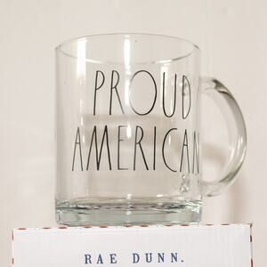 RAE DUNN Proud American Clear Glass Coffee Tea Mug Patriotic Americana USA