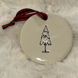 • White ornaments with black lettering, silver ornament topper, and black and red buffalo check ribbon.