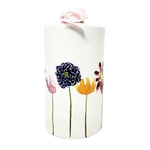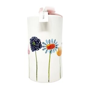Rae Dunn ceramic cylindrical birdhouse with watercolor flowers. Says NEST. Hard to find item. Rare.