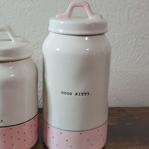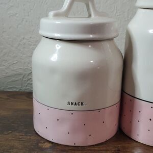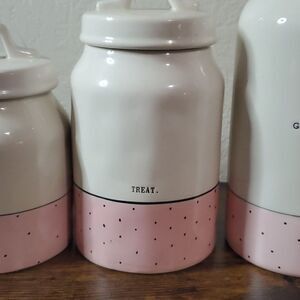 RAE Dunn pink polka dot canister set Typewriter Font HTF
