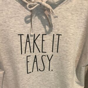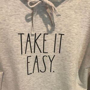 Super soft gray hooded sweatshirt by Rae Dunn. Perfect for the busy holiday hostesses! Size XS but more like a M. Pit measures 24”.
