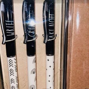 Rae Dunn Signature Pen Set with arrows, rainbows and plus signs. ‘write’, ‘create’, ‘take note’.