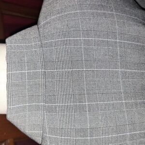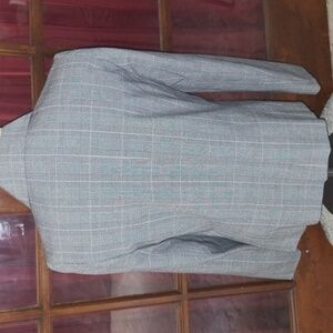 RAFAEL SHIRT/BLAZER GLENPLAID lightweight Polyester Rayon. Fully Lined. Size 6. New has paper button covers. High Neck with pointed collar. Front details sewn seams to give a more fitted flattering fit. Chest 19" length 23". Shoulder pads. Colors black, white, and light blue. Buttons are gray.