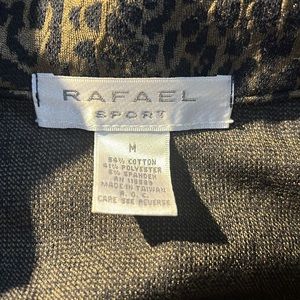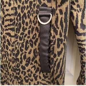 This lightweight jacket has a brown background with black print throughout, front pockets with black ribbon accentednt and a silver ring detail and front zip. It’s in excellent condition. It’s made of cotton/polyester/spandex so it has some stretch. Would be great for office or casual with jeans. The size is M. Great addition to your wardrobe!!