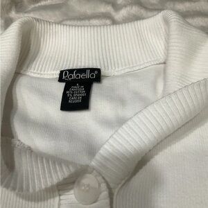This is a Rafaella women's white pullover sweater in size large. It has a V-neckline, 3/4 sleeves, and a collared neckline with button accents. Made of spandex and cotton in a tight-knit fabric, it is suitable for travel, parties, casual wear, or business settings. The sweater is machine washable and features a regular fit with stretch for comfort. Ideal for winter, fall, and spring seasons.