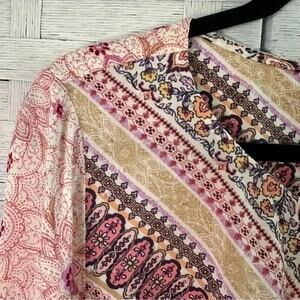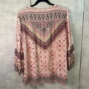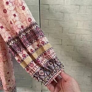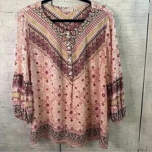 RAFAELLA bohemian feminine peasant, blouse, balloons, sleeves, cream pink purple & tan in excellent condition
