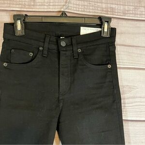 In excellent used condition no rips, tears or stains. jeans in black denim with a two-tone hem. High-rise. 5-pocket style. Button/zip fly; belt loops. Fitted thru thighs. Flared from knees. Cropped above ankles. Released hem. Ragged double layer hem, dark coal wash, raw frayed hem, split hem and flare silhouette.