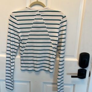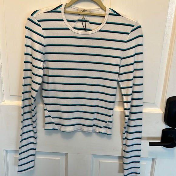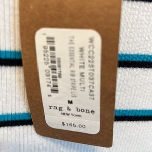 Adorable Rag & Bone ribbed tee shirt in white with blue and black stripes. Made out of 99% Pima cotton and 5% spandex. Size medium, brand new with tags.
