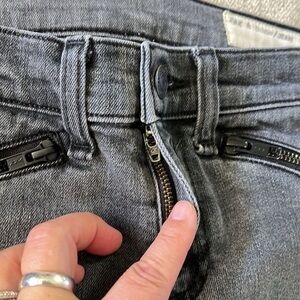 Black/ Gray Rag & Bone distressed Blackthorn skinny jeans with added zipper details & zip up at ankle.