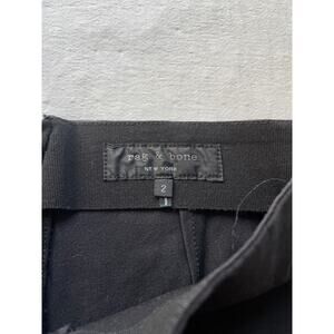 Elevate your style with these stunning black skinny tuxedo pants by rag & bone. Crafted with high-quality lamb leather trim, these pants feature a flat front and zip closure for a sleek and modern look. The stretch material ensures a comfortable and flattering fit, while the solid pattern and black color make them versatile for any occasion. These pants are perfect for any fashion-forward woman who wants to add a touch of sophistication to her wardrobe.