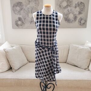 From Rag & Bone, an asymmetrical sleeveless plaid dress with a tie waist wrap panel bottom.