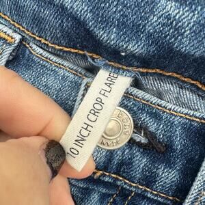 RAG & BONE JEAN 10 Inch Crop Flare Distressed Blue Denim Jeans Size 25. These jeans feature a classic blue wash with a distressed detail on the left knee and a raw hem. The crop flare silhouette offers a modern and stylish look. The rear pockets are detailed with subtle stitching and distressing.
