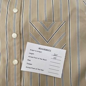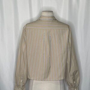 Point collar at neckline ~ Long sleeves with buttoned cuffs ~ Button closures down the front ~ Single chest pocket ~ Pleat on the back under the yoke ~ Straight hemline ~ Cropped length ~ Crisp unlined non-stretch woven fabric ~ Tan with vertical stripes in navy blue & white … color is called “Khaki Multi”
