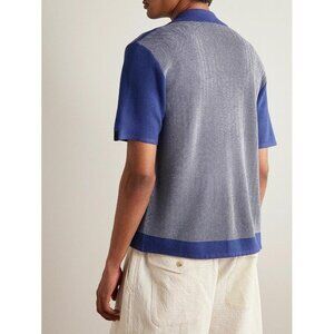 Jacquard-knitted with a blue and white herringbone pattern. It's cut for a relaxed fit and has a laid-back camp collar.