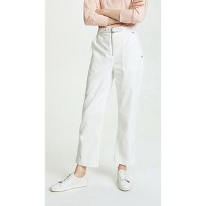 Fabric: Twill. Buckle detailing at front. Brushed silver-tone hardware. Straight-cut style. Ankle length. Self-belt at waist. Exposed zip at front. Slant hip pockets. Patch back pockets. Shell: 100% cotton. Size 28. Good preloved condition, small discoloration spot on corner of pocket shown in last photo