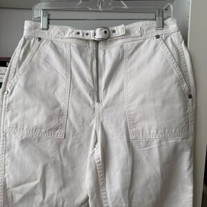 Fabric: Twill. Buckle detailing at front. Brushed silver-tone hardware. Straight-cut style. Ankle length. Self-belt at waist. Exposed zip at front. Slant hip pockets. Patch back pockets. Shell: 100% cotton. Size 28. Good preloved condition, small discoloration spot on corner of pocket shown in last photo