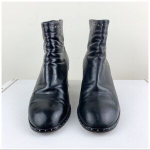 Rag. & Bone Women’s Black Lambskin Willow Ankle Booties w/Back Zip and Tiny Silver Studs Sz 9.5 EUC. Some wear to sole, creasing and small nick as shown. A stunning boot. Chunky 2.5” stacked heel. Shaft 5”. Buttery soft leather. Please see photos for additional details.