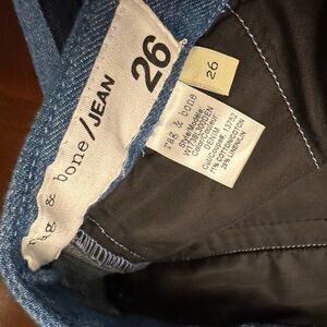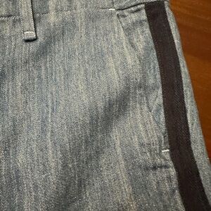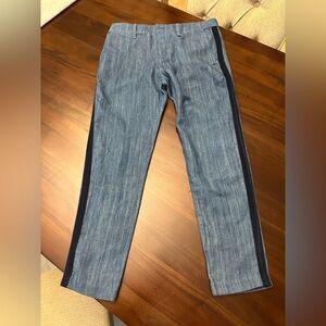 Rag & Bone chino denim pants with contrast side panels. Zip fly with hook closure. Side and back pockets. Inseam: 26.5" Rise: 12"