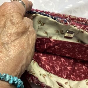 Questions? Leave a comment below! we have a absolutely wonderful craft fair here called corn Hill Festival once a year. These are handmade by artists that come from all over the United States. I can’t put into words how beautiful it is. It is burgundies and blues, and some light ivories or beige multicolor blues in there. The strap looks like an alligator strap. It’s incredible. This is from my personal collection. It’s positively one-of-a-kind. It’s absolutely gorgeous. It’s an ample shoulder strap. It goes about 15 inches. That would be from the top. It’s just me measuring it in half and then you see the width in the pictures and the height is about 10 1/2 to 11 inches. It’s a good size. It’s stunning. You can see the beautiful interior with the lovely flowers and then the burgundy there are two packets and another packet that’s huge. It has a Velcro attachment to it so that you can be really secure when you’re using it. These artists make their living with this and I’m a sucker. I always buy them then I have too many but you’ll benefit because it’s positively gorgeous it’s a must have