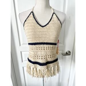 Raga Eggshell Crochet Tassel Halter Top Knit Sz S New
