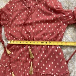 This Elle Tiered Maxi from Raga is new without tags. Gorgeous long sleeved maxi dress perfect for all occasions. Style with an ankle boot and denim jacket on cooler days, or pair with a strappy gold heels for a dressier look. Beautiful deep rose color with gold dots. Size L.