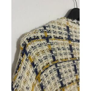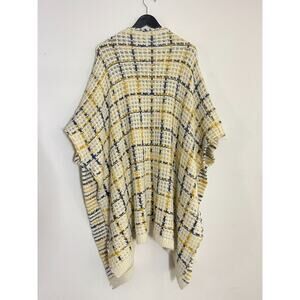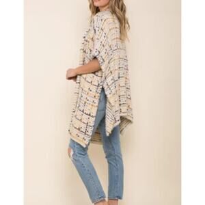 Cozy knit cardigan with a multicolor pattern. Features short sleeves and open front. Perfect for layering.