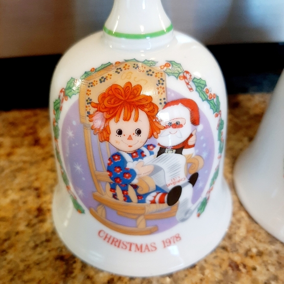 Set of two vtg Raggedy Ann ceramic Christmas Bells. 1977 and 1978 collectible bells by the Bobbs-Merrill Company. EUC no chips or cracks. Bells are approximately 5.75" tall.
