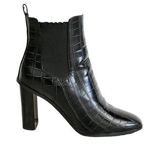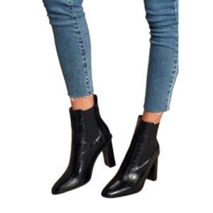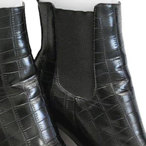 Sleek, crocodile-embossed vegan leather shapes these ultra-chic heels with an almond toe upper, with an ankle high shaft with elastic gussets, and a slender block heel. Pull tab at back for an easy on and off.