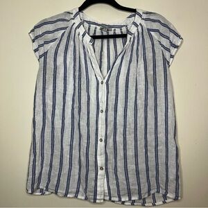 “Soft and lightweight, this Alena Top features blue-and-white stripes. The luxe linen fabrication is light and airy. Subtle shirring, a deep v-neck, and raglan flutter sleeves give it an ultra-feminine feel.”