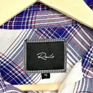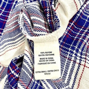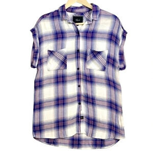 Plaid button-front shirt with cuffed cap sleeves, featuring patch chest pockets. Rounded shirttail hemline.
