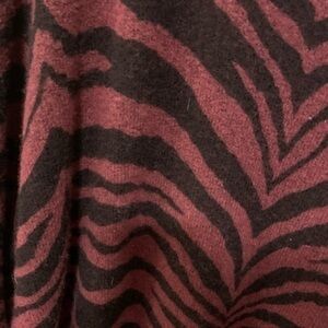Long sleeve, luxe wool and cashmere blend, a burgundy crew-neck pullover sweater featuring black tiger print and contrast black ribbing detail at the collar, wrists, and bottom hem.