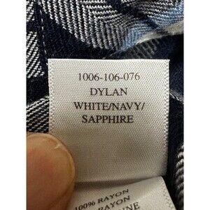 Point collar. Long sleeves with button cuffs. Button closures at the front. Patch pockets at the chest. Sapphire plaid. 100% rayon, machine wash.