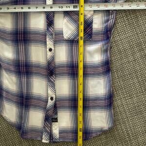 The Hunter White Dusk button up is a simple blouse that can be worn with just about anything. This top is made by Rails and is a white body with periwinkle blue and a thin red stripe throughout. 100% rayon. Hand wash in cold water and hang to dry. Made in the USA.