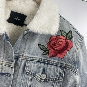 Rails faux fur denim embroidered distressed jacket, With raw hem and embroidery distressed in some areas new with tag 100% cotton.