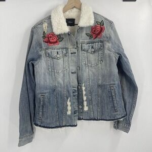 RAILS Jean Jacket Ramsey Floral Embroidered Distressed Denim with Ivory Fur L
